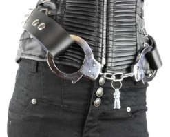 Lock up your look with this handcuff belt! Made of a sturdy, high quality leather, this belt features triple row pyramid stud styling and a handcuff “buckle” that actually locks and unlocks with the keys. With multiple ways to wear it, we love it thrown over a skirt, pants, or tight black dress.