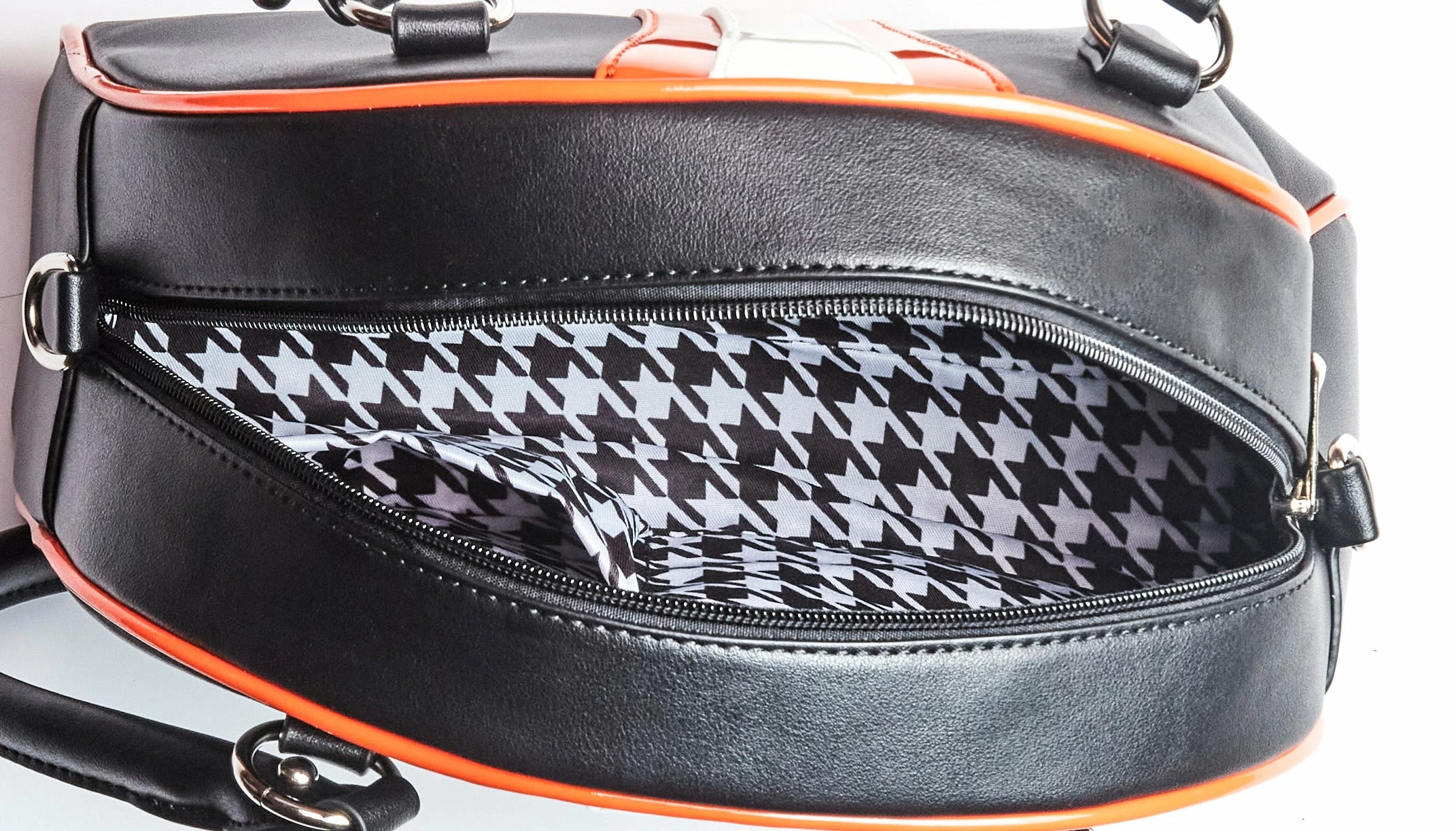Introducing the Bovver Clockwork bowler bag. That 60s orange and white accent… pops! Bovver bowlers are made of a durable black matte vinyl and trimmed in a contrast high gloss. Rounded handles are reinforced by silver round studs. You’ll find signature metal Bovver hardware on the front panel. Detachable crossover strap is included. Inside you’ll find black and white houndstooth satin lining featuring 1 zipped pocket and 2 side slit pockets.