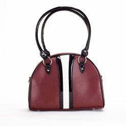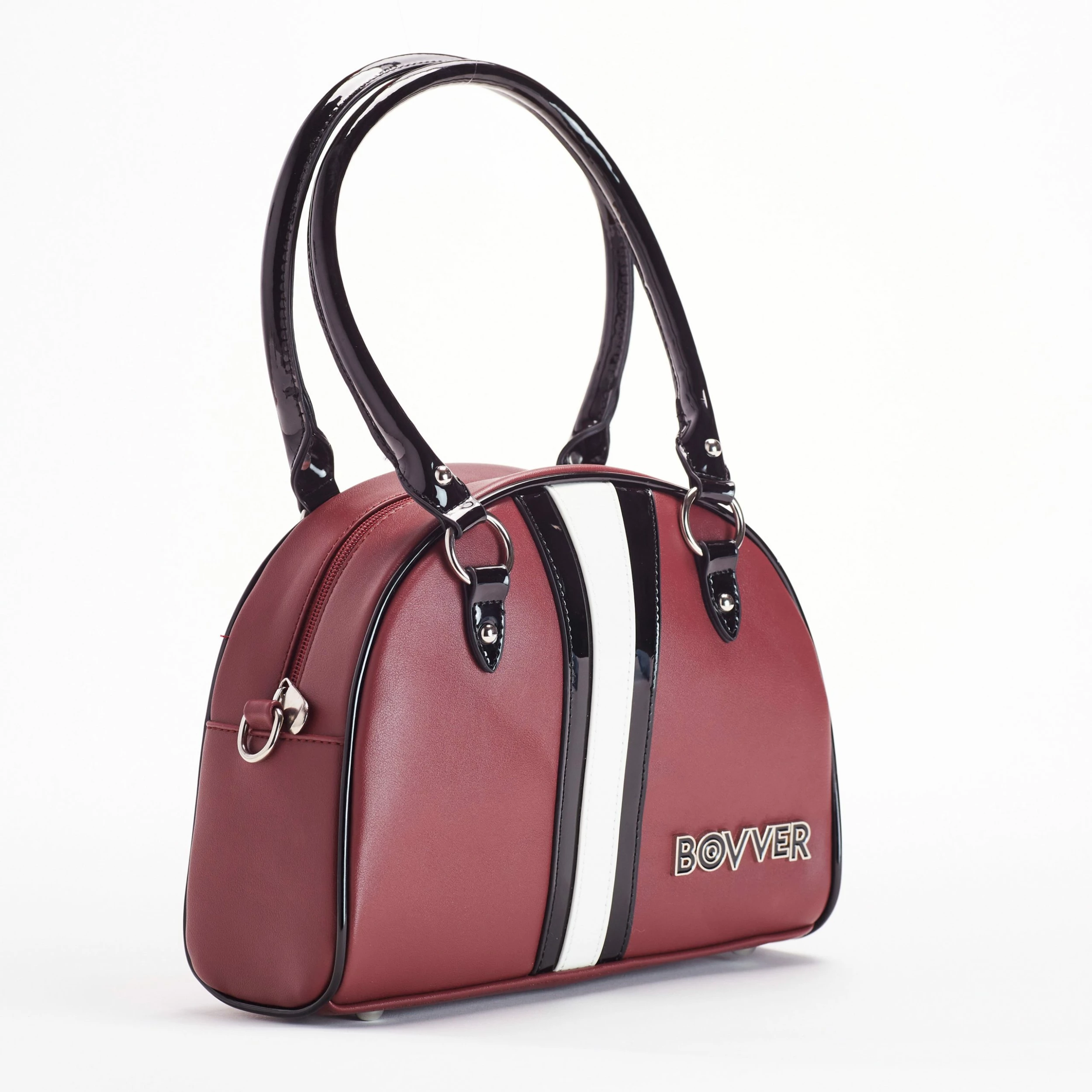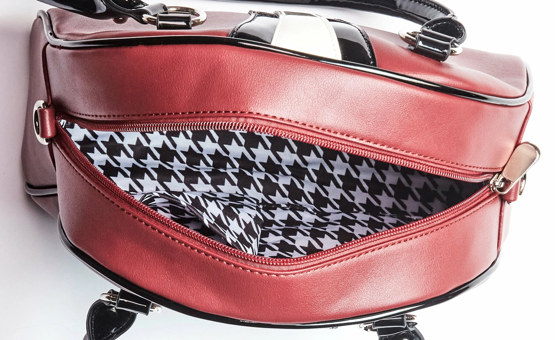 The oxblood Bovver bowler was color matched to pair up with your favorite oxblood boots. The front panel detail is nicely stitched in a black and white gloss. Bovver Bowler bags have a classic carryall shape. Use the rounded handles or a detachable crossover strap to carry. Handles are reinforced by silver round studs. Finished withΒ signature metal Bovver hardware. Inside you’ll find black and white houndstooth satin lining featuring 1 zipped pocket and 2 side slit pockets.