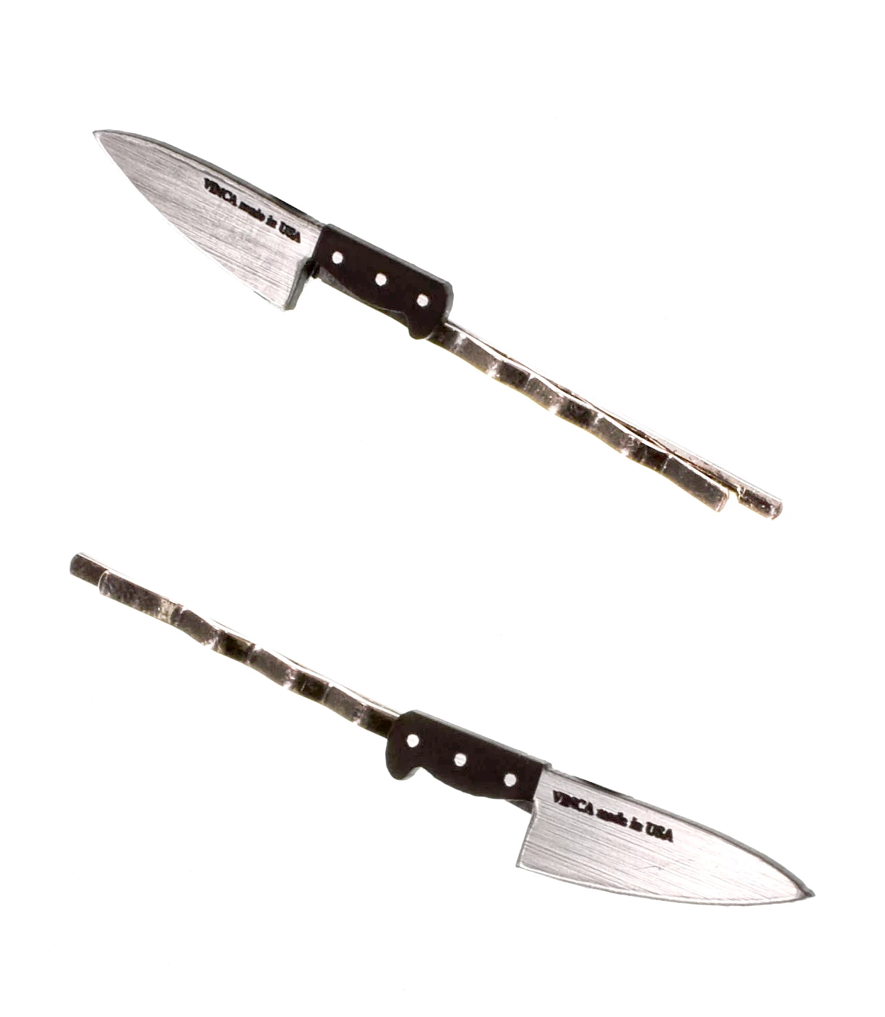 Unruly hair got ya feeling stabby? Tame your tresses with these Chef’s Knife Bobby Pins! Made from acrylic and affixed to a silver plated brass bobby pin. They are sold as a set of two – one left facing bobby pin, one right facing bobby pin.