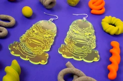 Not since the beginning of time has the world beheld terror like this! Enjoy your very own Creature Feature with these killer acrylic dangle earrings from Frank Goodness. Photos don’t do them justice–the neon acrylic is to die for!