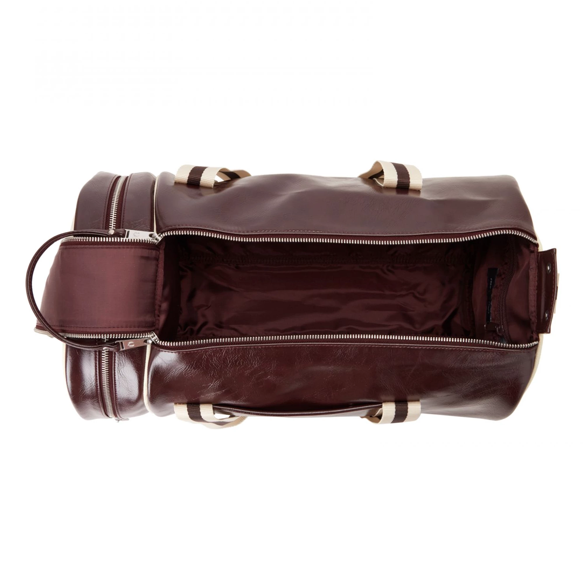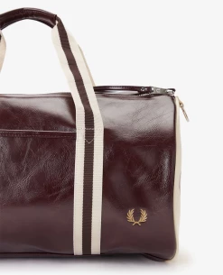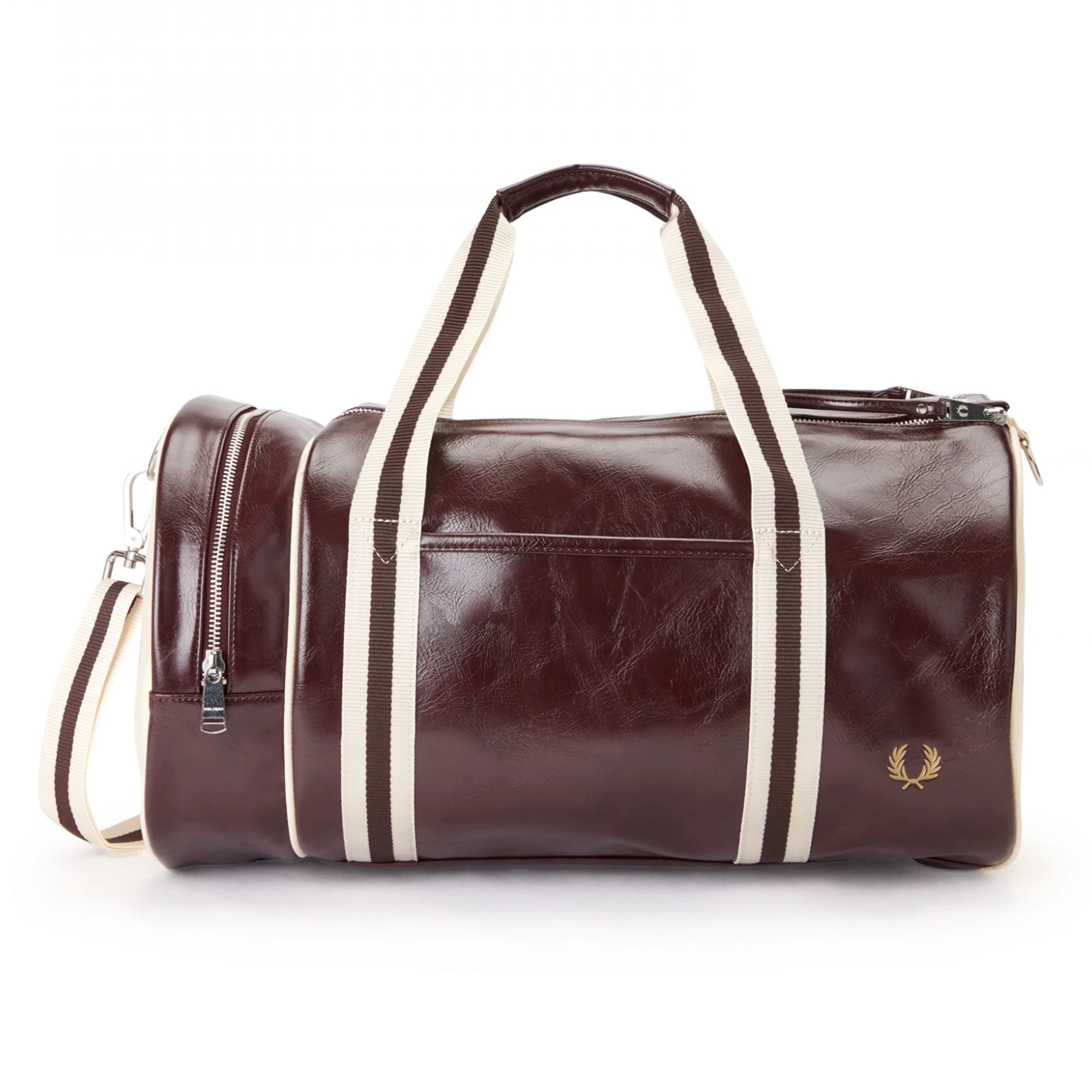 Used by sportsmen and women for decades, the classic Fred Perry Barrel Bag remains unchanged. Crafted from a tough PU in port with ecru accents, this bag features strong webbing handles, debossed branding, silver-tone hardware, double-zip closure and a zipped compartment at one end. The interior has an additional zip pocket and zip compartment. Functional, durable and unmistakably Fred Perry.