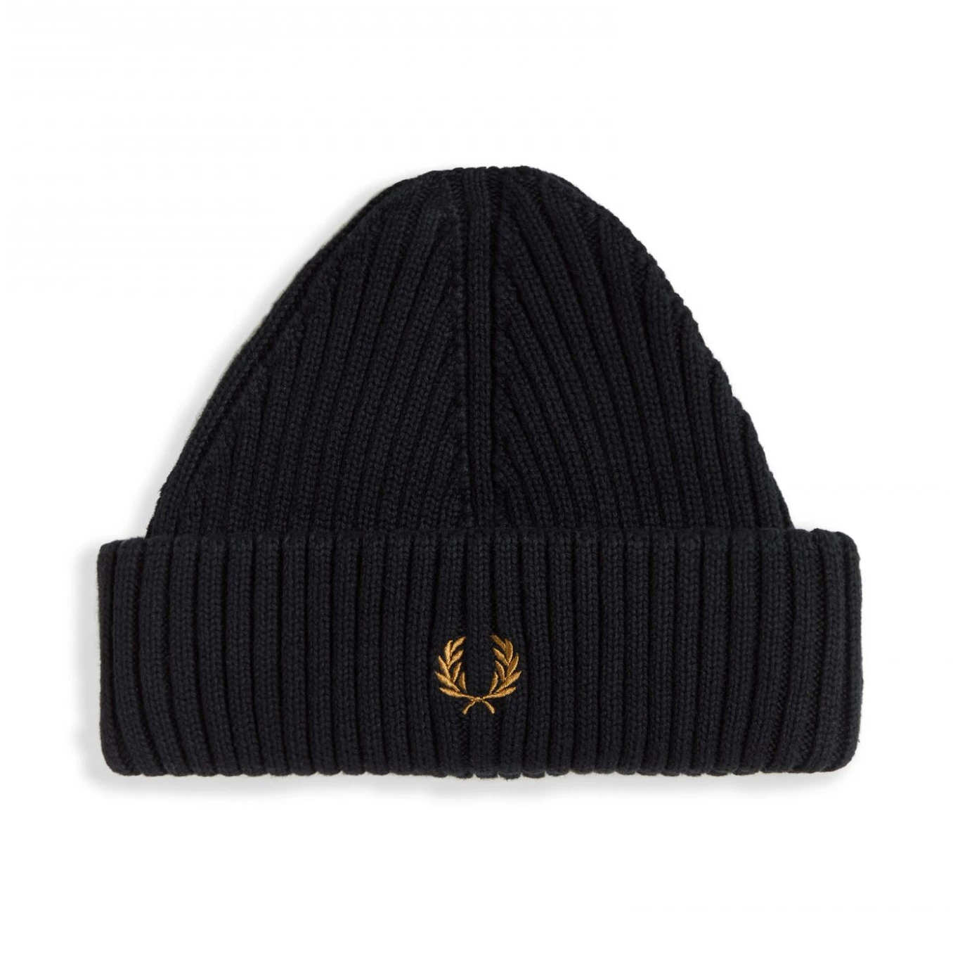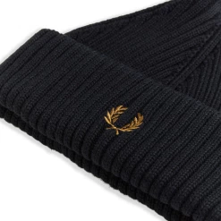 This classic short ribbed knit beanie from Fred Perry is crafted from a soft and warm cotton. It features a double turn-up cuff and their signature Laurel Wreath embroidery in metallic gold.