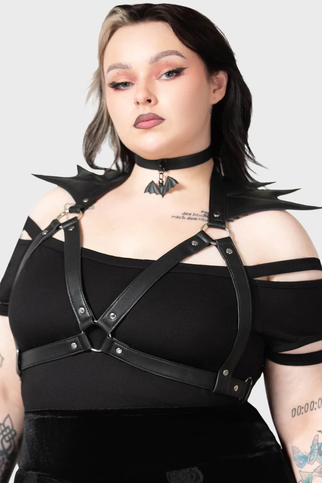 Become a true creature of the night in the Totally Bats Harness from Killstar. This statement faux leather harness features metal hardware details, complete with a killer winged collar detail. Adjustable buckle closure for a perfect fit.