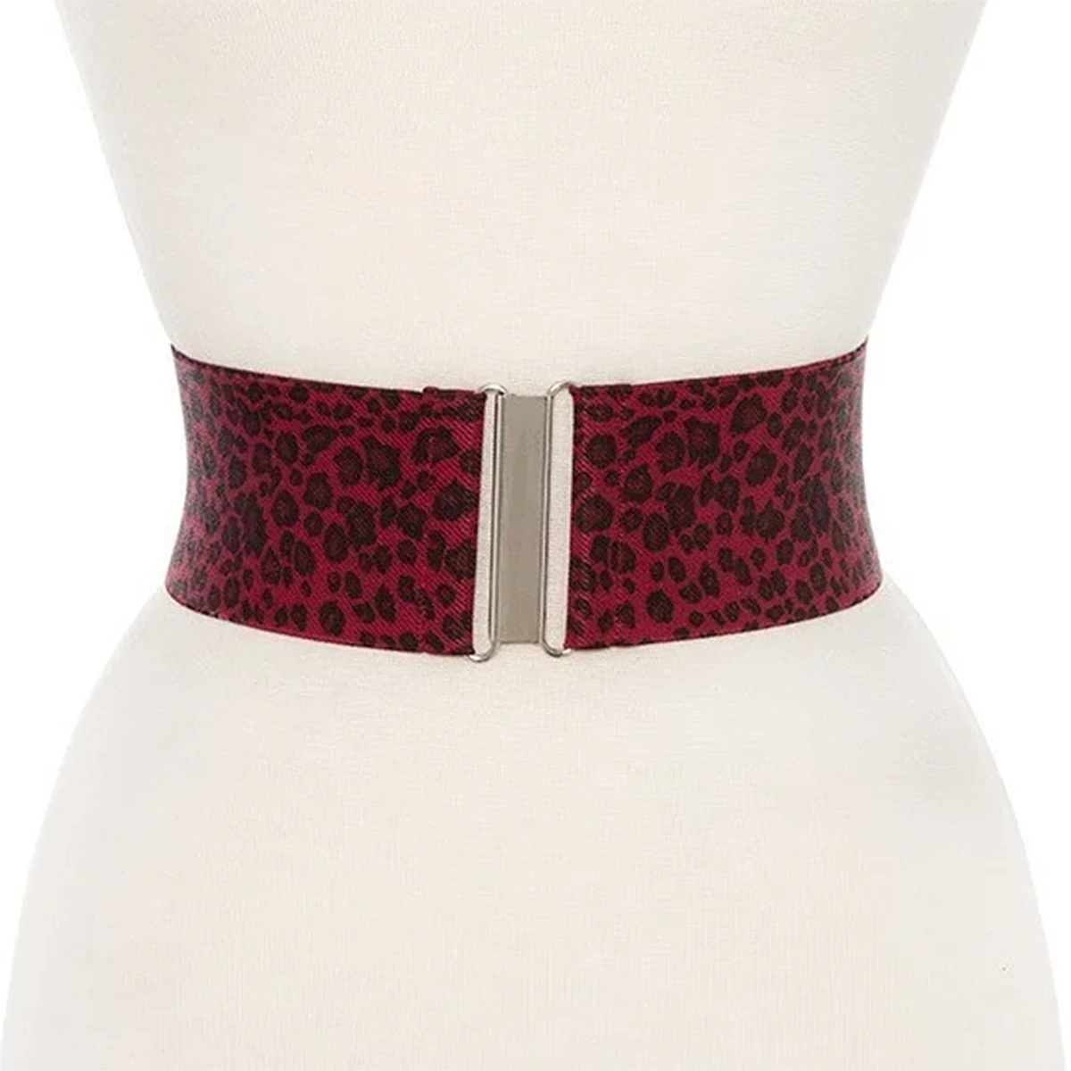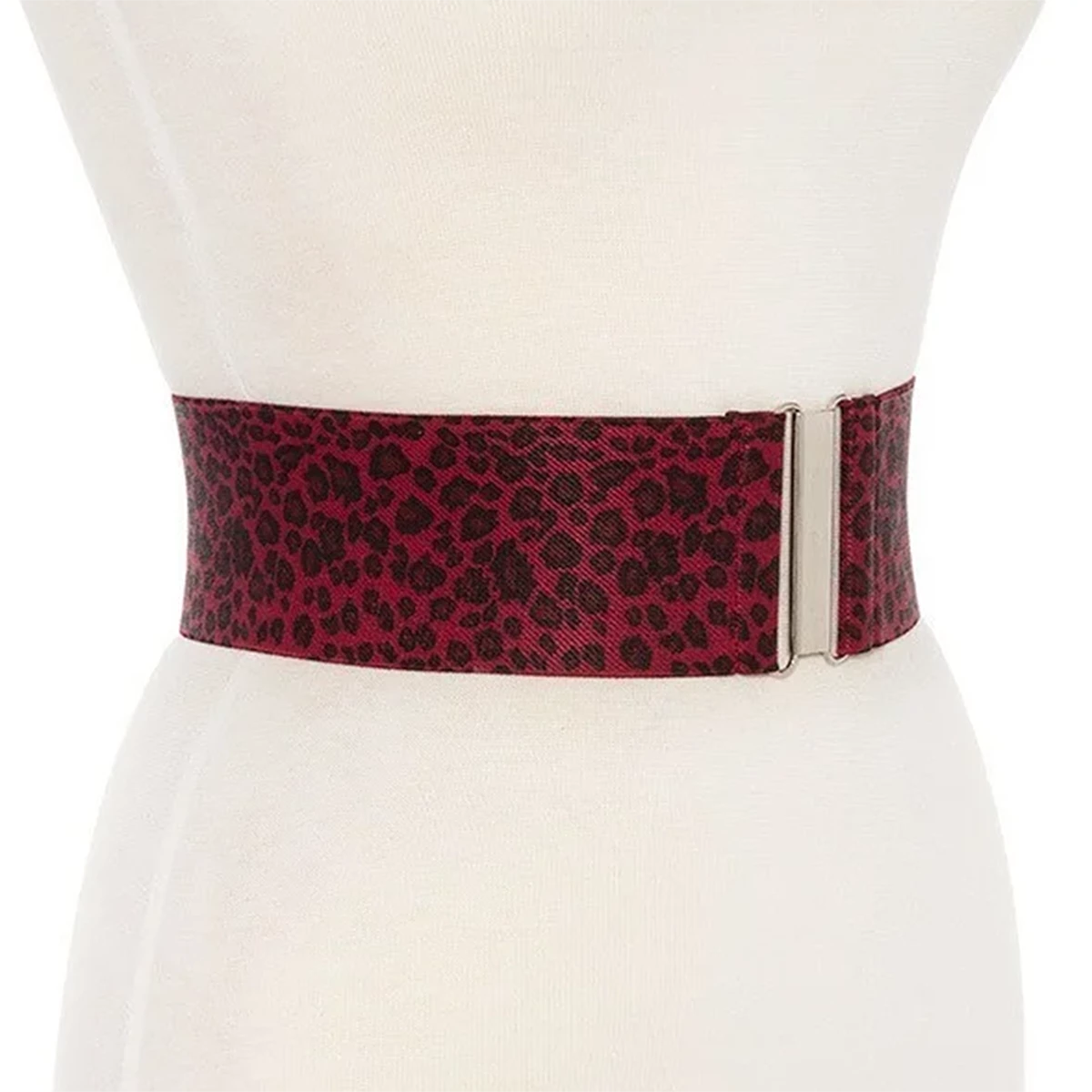 Add a lil’ leopard while cinching in those curves with this elastic belt with an all over leopard print pattern in deep red and black. It securely fastens in the front with a silver colored clasp.