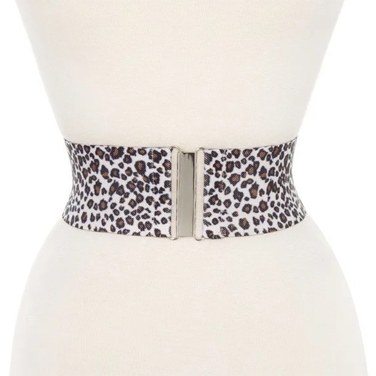 Add a lil’ leopard while cinching in those curves with this elastic belt with an all over leopard print pattern in white, brown and black. It securely fastens in the front with a silver colored clasp.