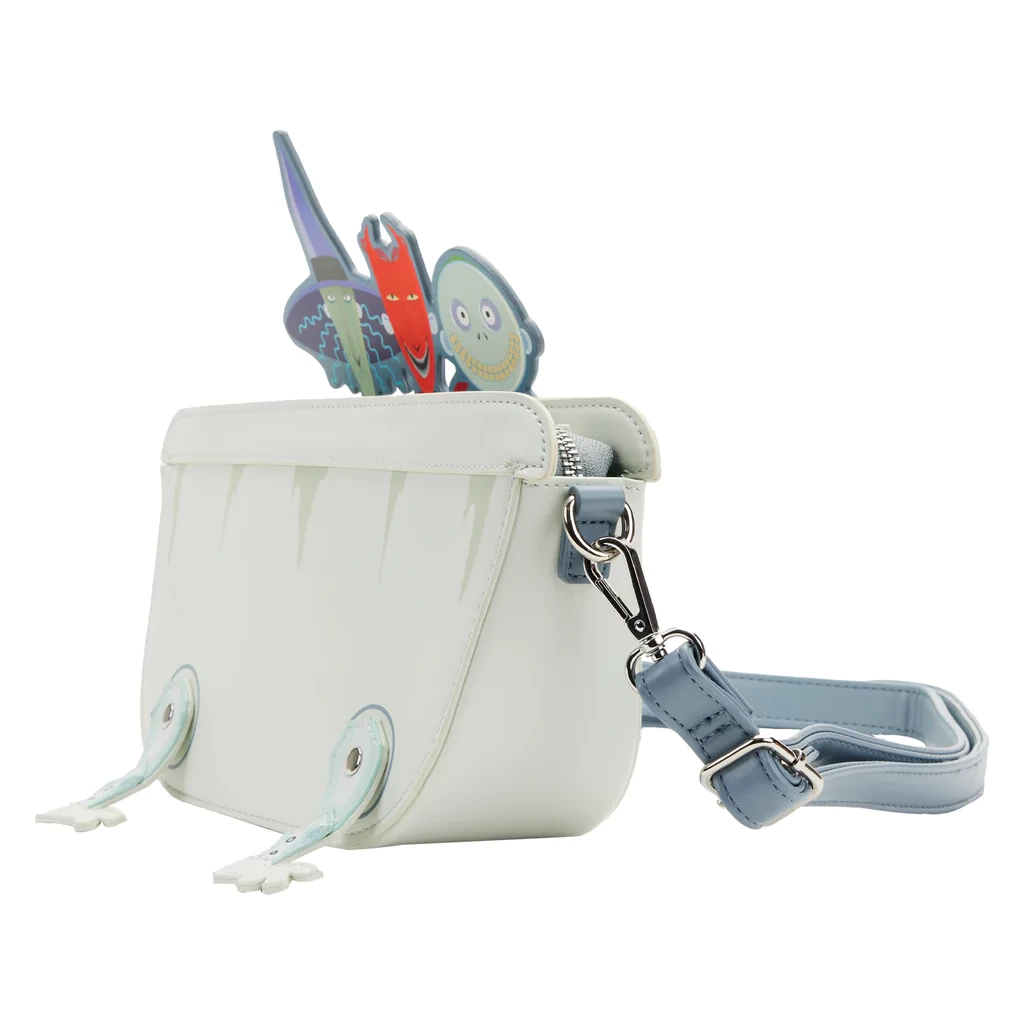 Oogie Boogie has sent his finest trick-or-treaters to carry out his dastardly plans. Stay on his good side, or he may send his mischievous henchmen after you! The Loungefly Nightmare Before Christmas Lock, Shock, and Barrel Bathtub Crossbody Bag features Oogie’s trio of underlings as they take a ride in a mechanical bathtub. Wearing costume masks that glow in the dark, Shock, Lock, and Barrel move up and down as the tub carries them away. An enamel bear trap zipper charm dangles over the side, providing easy access to all your tricks. The feet of the tub move back and forth to really set trouble in motion! This creepy crawly accessory adds some frightful fun to any outfit and will keep your belongings safe on any journey.