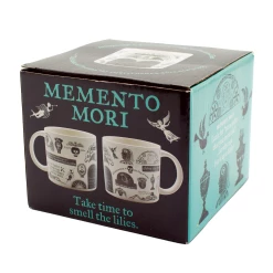 Designed with images carved into burial monuments, this stone-colored Memento Mori mug will remind you to take time to smell the lilies. Surrounding the mug are angels with trumpets (hurrah!), skeletons with hour glasses (tick-tock, people!) and just enough Latin to hint that life is fleeting (Tempus Fugit / Fugit Hora). In the bottom of the mug is a reminder of the inevitable and an ouroboros to represent eternity. This dignified Memento Mori mug, in its own gift box, is perfect for gloomy people who need coffee or tea to… wake.