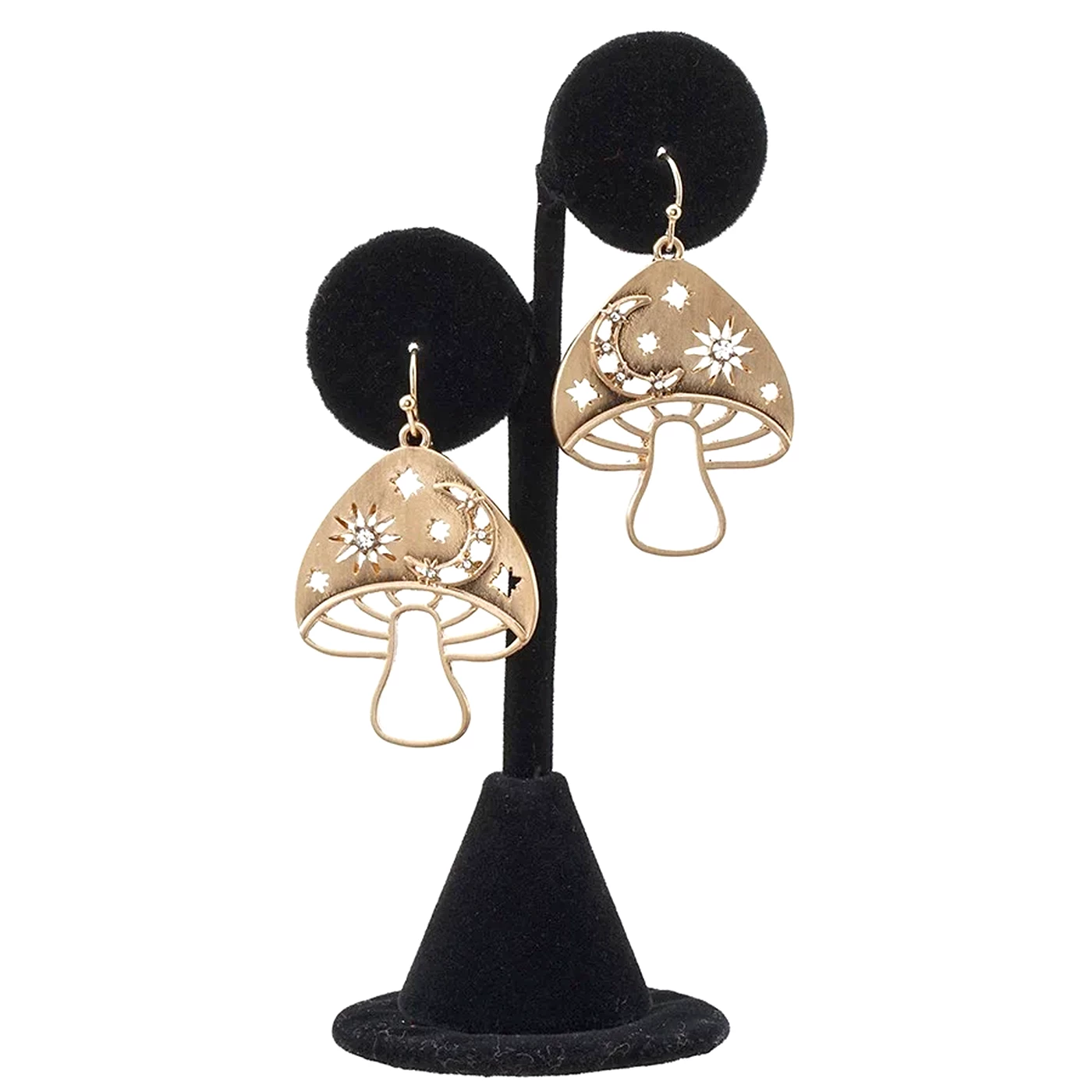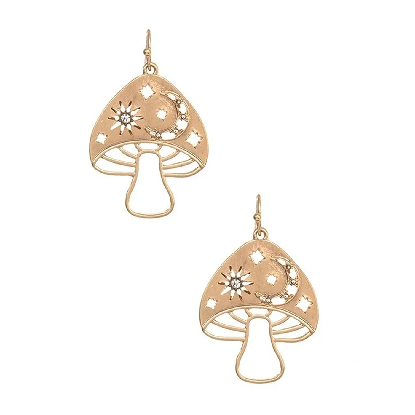 There’s magic in those mushrooms. Goldtone celestial themed mushrooms complete with tiny rhinestone accents hang from gold ear hooks for the perfect outfit-completing accessory.