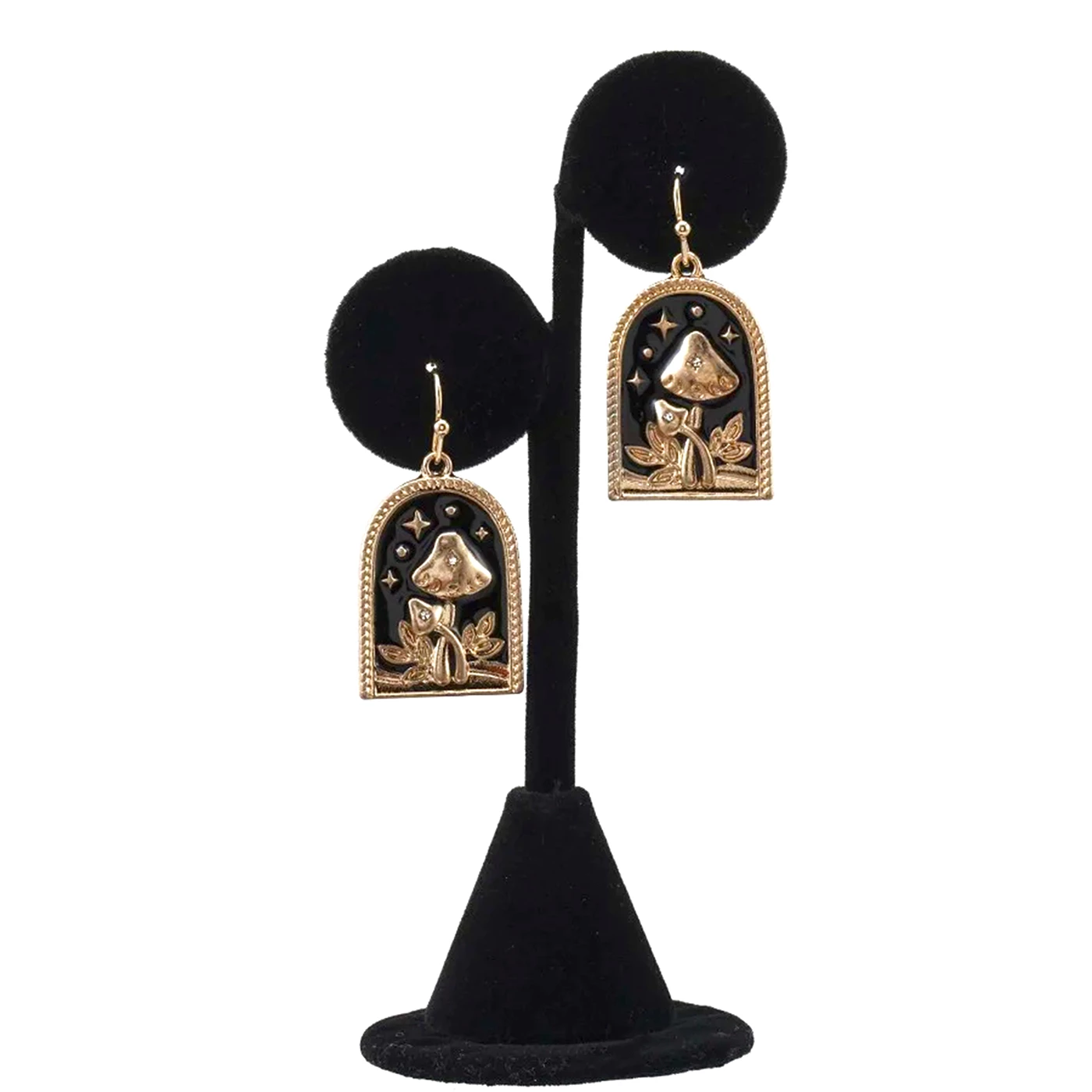 Deep in the forest grows the most magical of all mushrooms. Adorn your ears with these Night Mushroom Earrings featuring goldtone metal & enamel charms of mushrooms against a starry night background.
