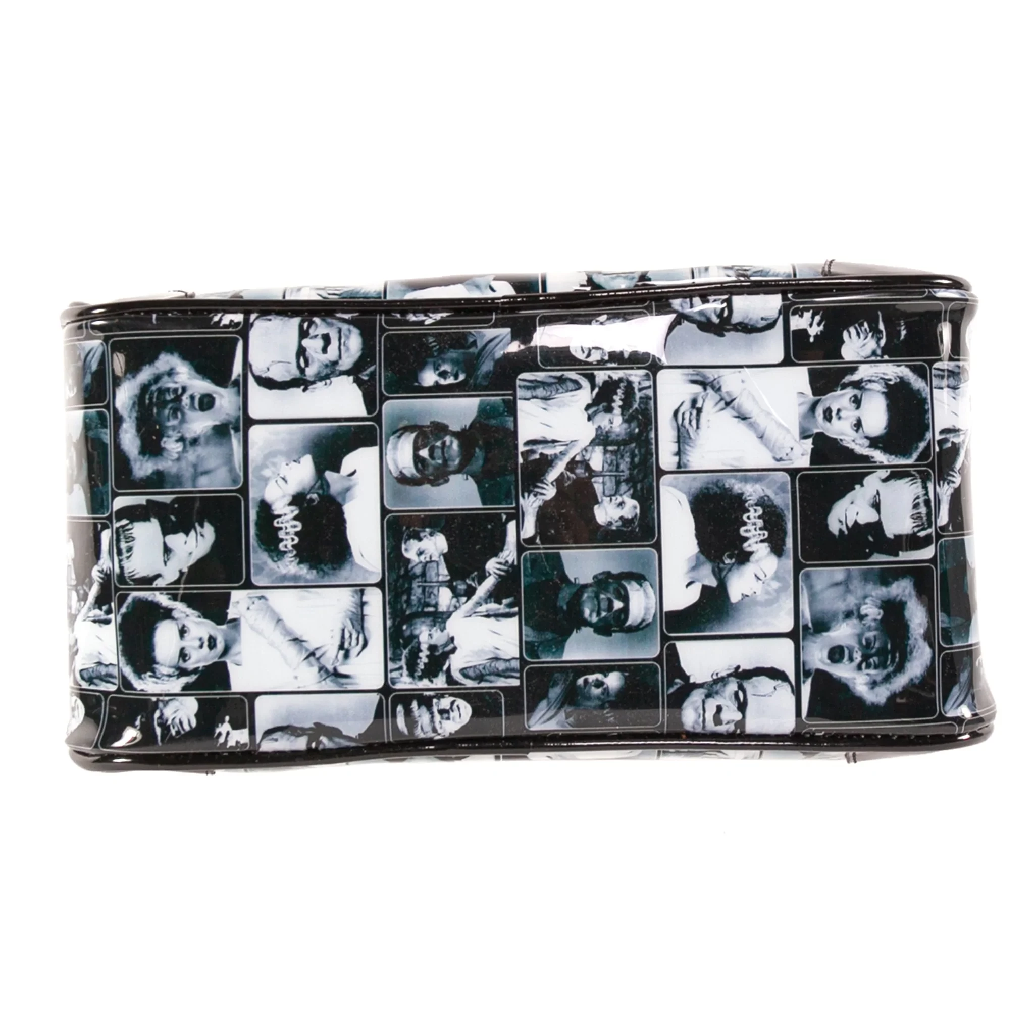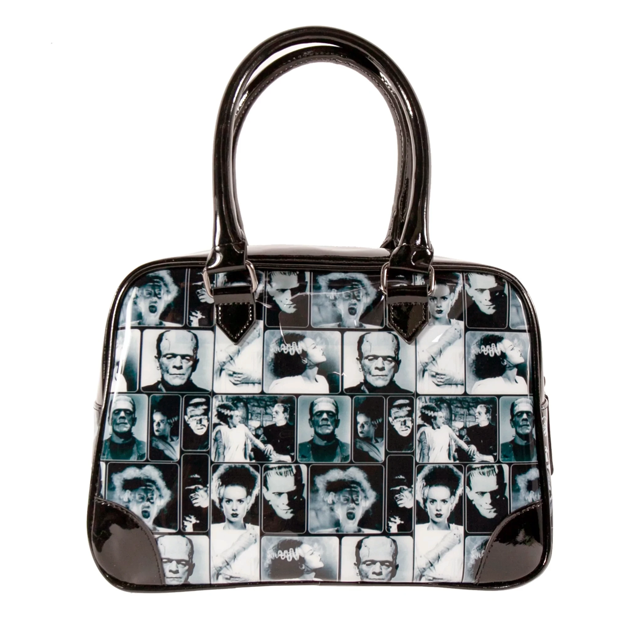 This bowler style purse from Rock Rebel features an all over collage of classic black and white images from Frankenstein and Bride of Frankenstein. The handbag is made with vegan vinyl with a full zip closure. Roomy enough to carry all your essentials!