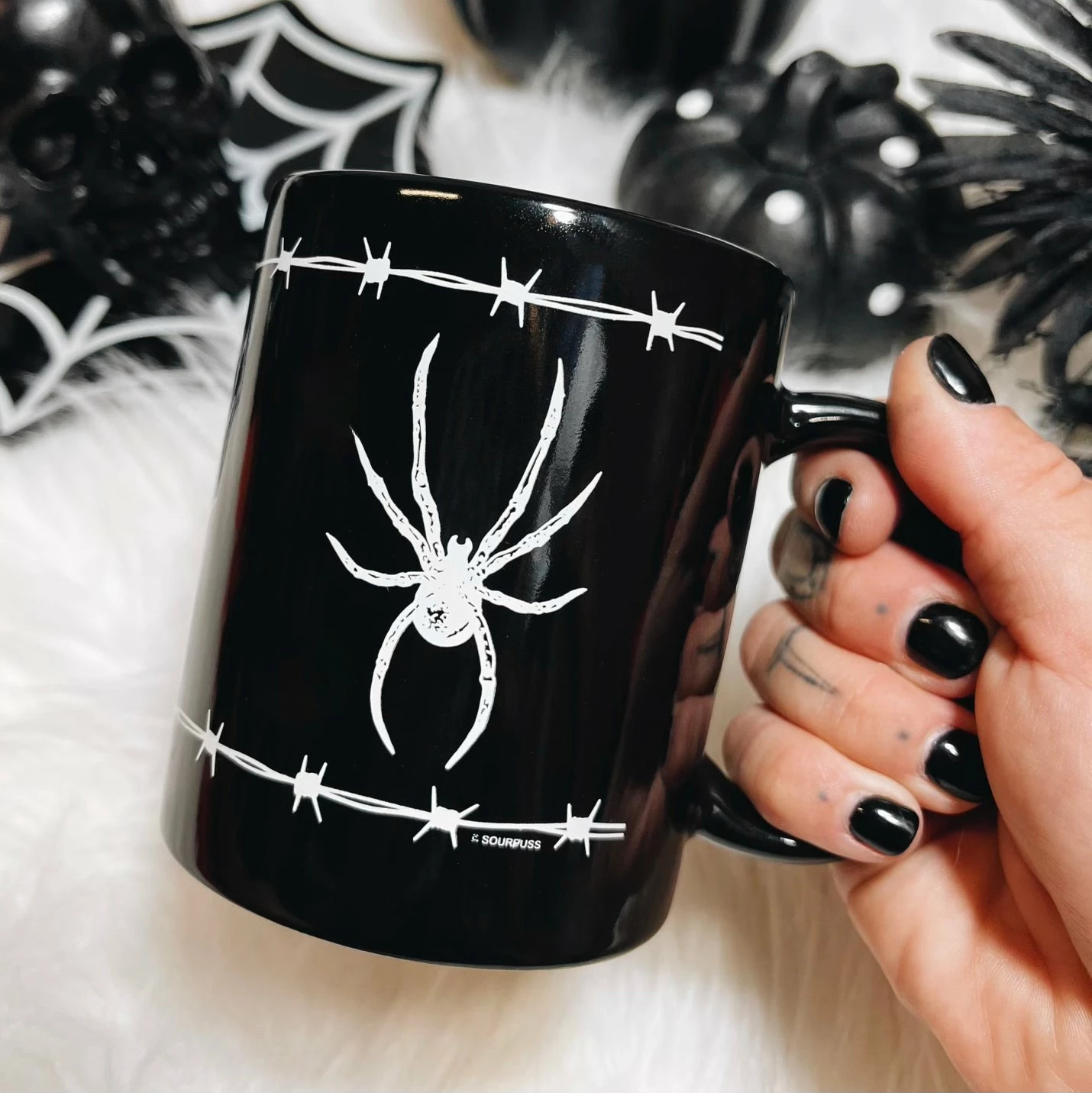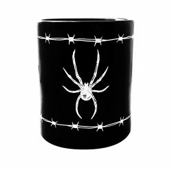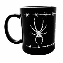 Coffee or tea? Pick your poison with the new Barbed Wire Spider mug! This ceramic mug is screen printed with a deadly lil arachnid friend and barbed wire.