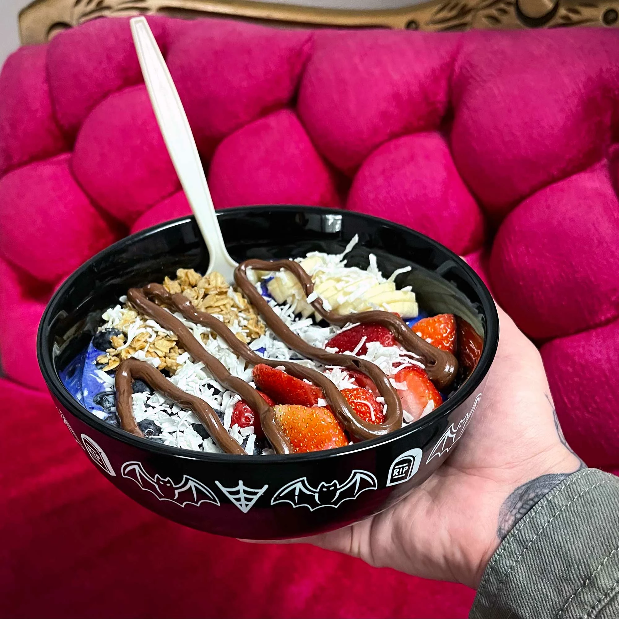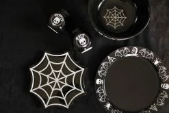 We’ve designed a creepy and cute bowl to enjoy your soup cereal or popcorn. Made of a shiny black ceramic and printed with skulls, bats, spiders, webs and coffins. Inside of the bowl is printed with a spiderweb.