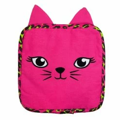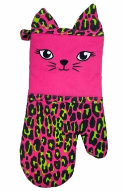 It’s time to turn the volume up on your music and your kitchen. Think pink and cats! Two of my favorite things. We have an oven mitt and pot holder set in bright pink with a splash of neon green and black with a Sourpuss of cat face. You’ll be cooking up something good in no time.