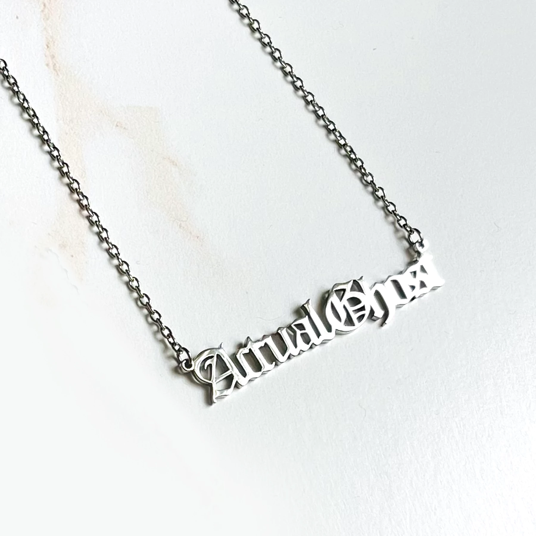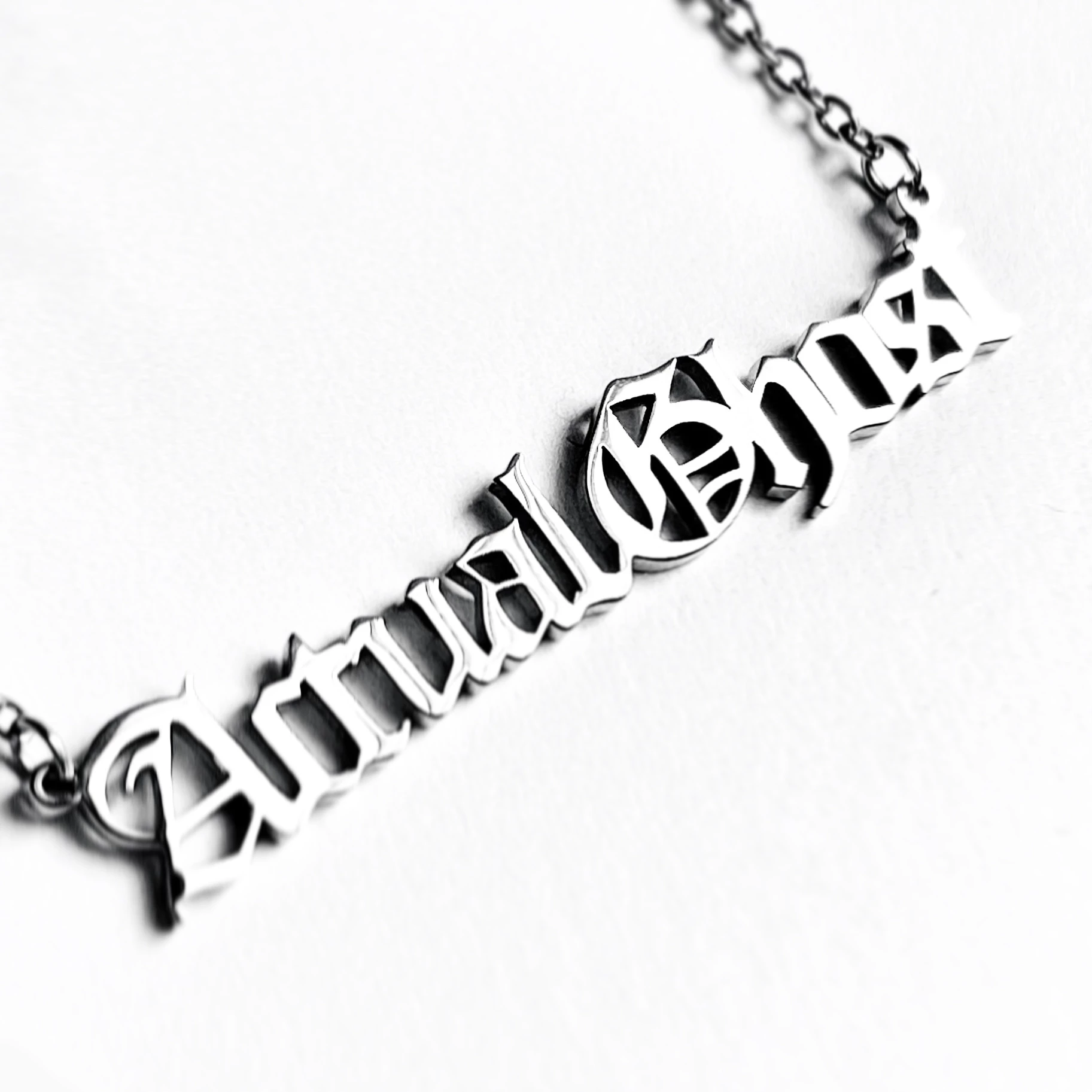 Spooky and quiet, just like you. This “Actual Ghost” name plate necklace from The Silver Spider has classic old english letters cast in stainless steel on a coordinating chain.
