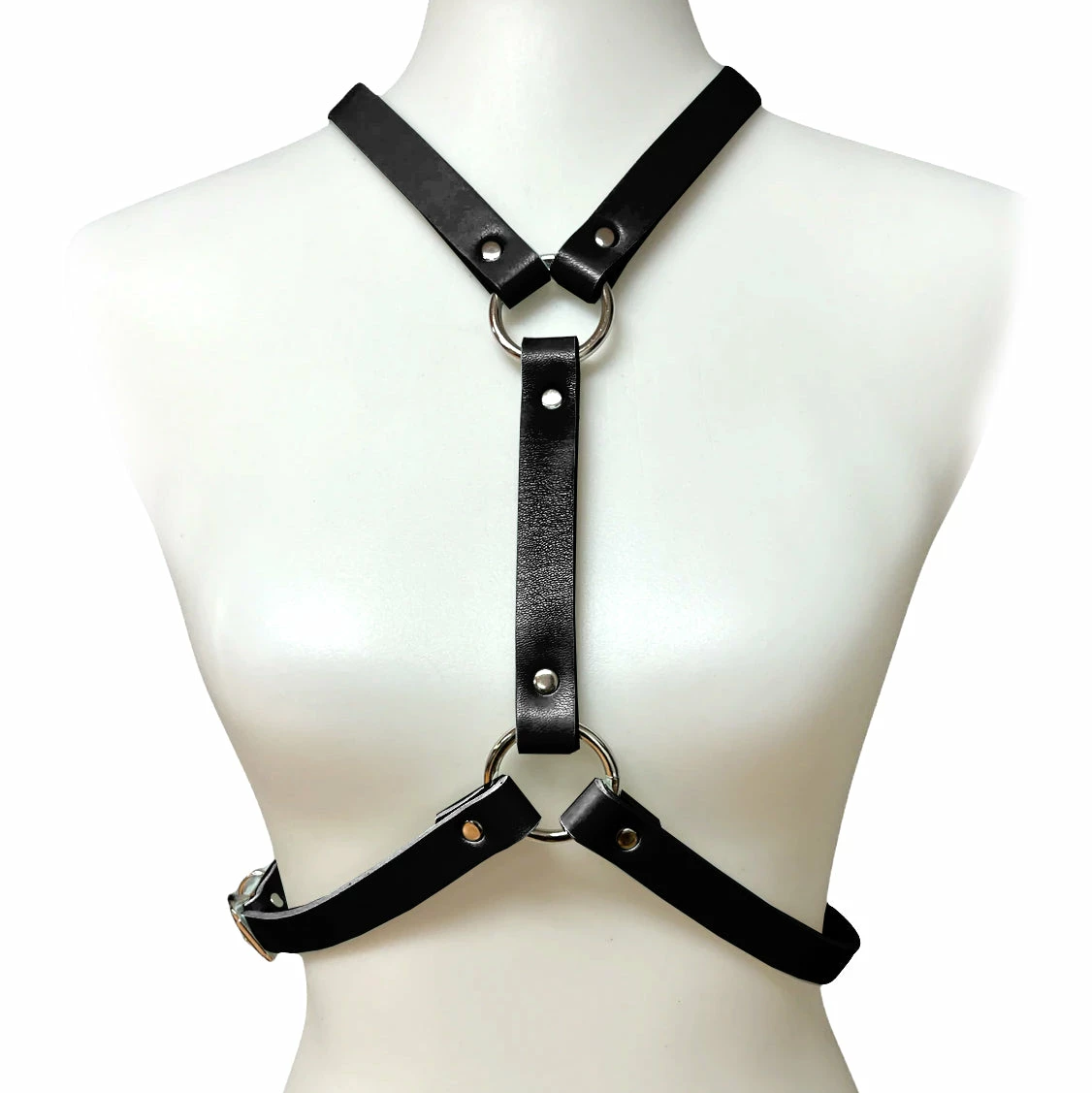 Made of high quality black faux leather, this Y Harness with O-Rings adjusts with buckles at the side for a perfect fit. Great for layering over basic black, it’s the perfect finishing touch to your outfit!